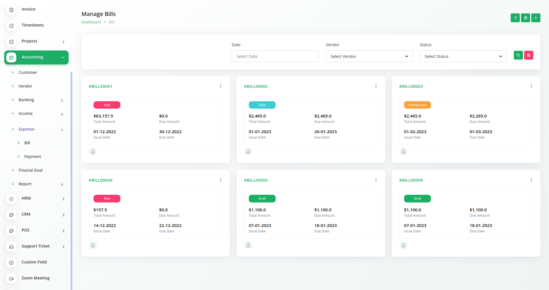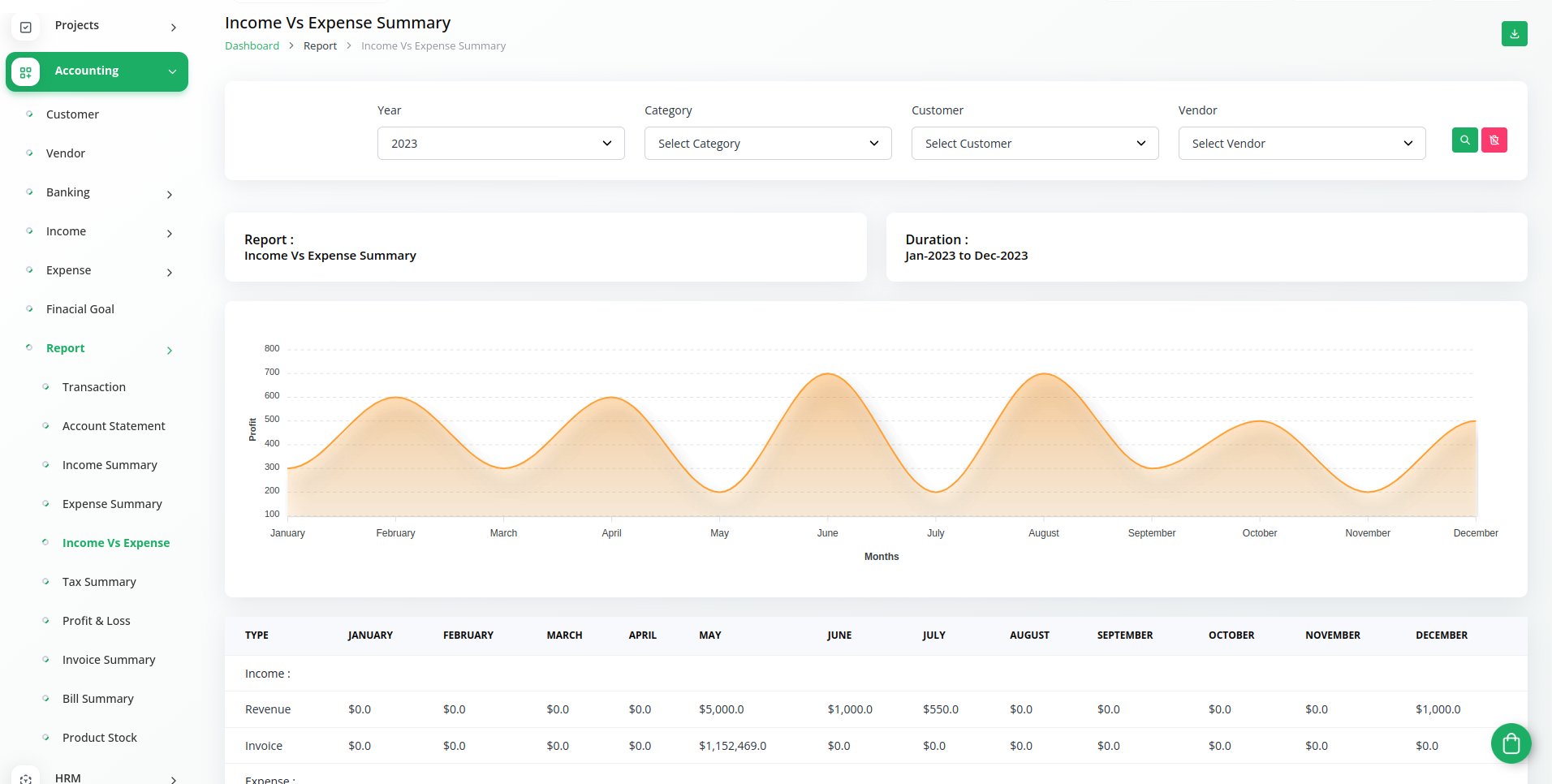 A budget is a financial plan for a specified period to keep in check with the working capital. This feature here helps to maintain the capital flow. You can set monthly, quarterly, half-yearly, or yearly budgets according to your business plans and needs. The main categories are “Income” and “Expense” where one can edit /update /delete the sub-categories as well.