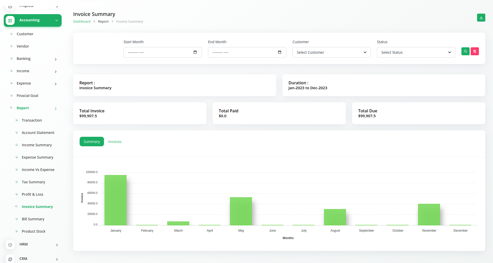 Get a report on transactions with an easy filtering option. Download the required account statements in either PDF, CSV, or Excel format. You get duly prepared reports on individual Income, Expenses, Tax, Invoice, and bill summary. Filter them based on Account, category, and customers. Also, a graphical display of the Income VS Expense chart along with a detailed calculation of Profit and Loss will help you make informed decisions. Filter the tax summary and Income VS Expense chart based on financial years.