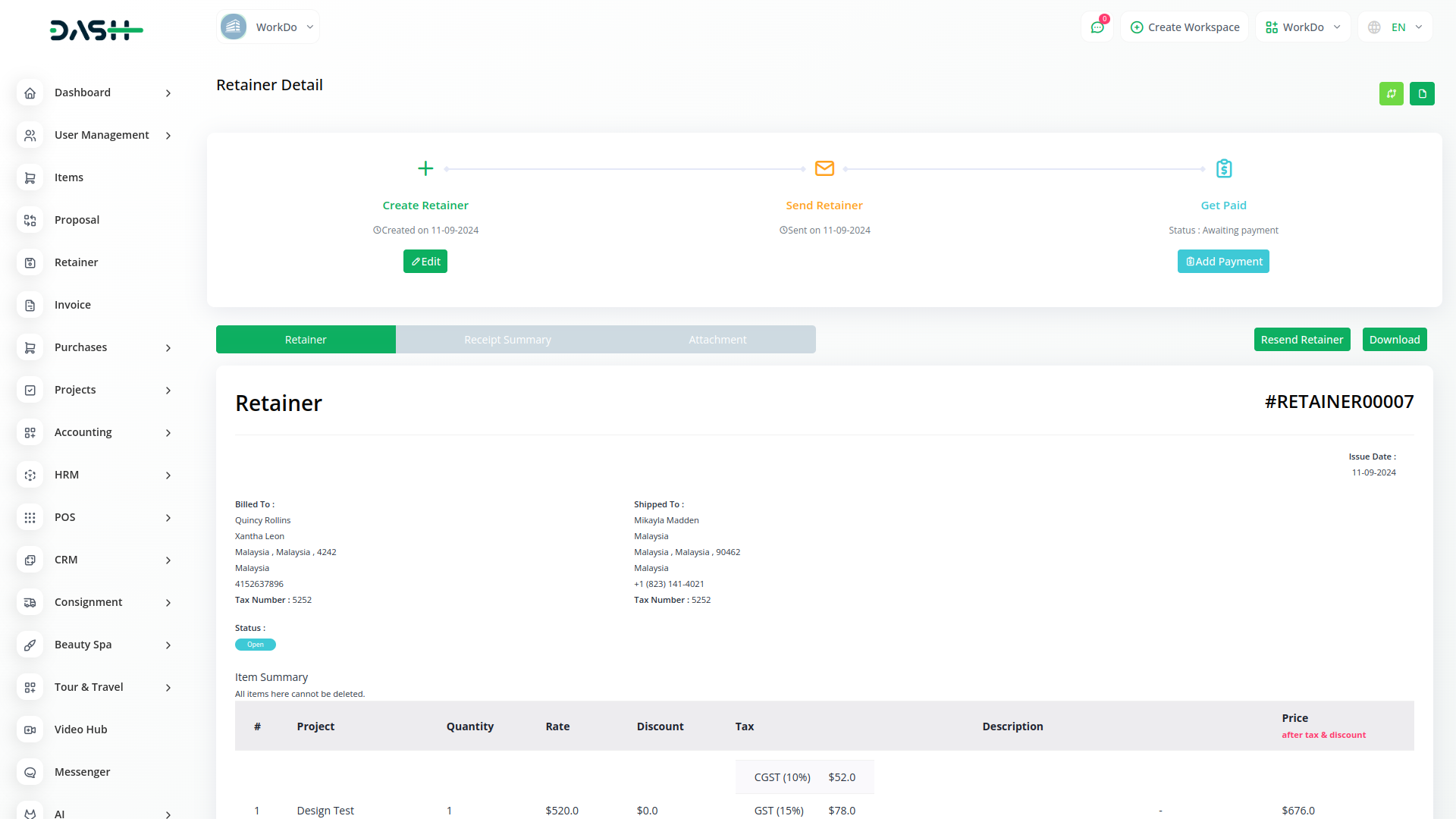 Retainer invoices are documents the firm can provide to the client to ask for funds prior to the project starting. Its a method of securing services for use when required. In other words, its a form of deposit or pre-payment.